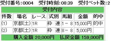みなさん、こん××わ。N島です。オリジナルの方の的中率がついに旧消費税率に近づいてまいりました・・・南無・・・・さて・・・表題のように再認識させられた。もろもろ考察の前に・・・・事件が起きた。そう、その事件に気がついたとき・・・私はニコニコ弁当生活へと舞い戻る腹づもりだった。12時ころにドトールの珈琲を購入したとき・・・・その重大な事件に気付いた・・・私はいつも当たり馬券を財布の中に入れているのだが・・・財布を開くたびにその存在を再確認している・・・しかし・・・珈琲を購入しようと財布を開いたときに・・・・どこをどう探しても・・・・これがないのだ↓単勝8.3倍の10K馬券・・・ない・・・ないんだ、どこにも・・・・私はブルーマンより顔面が蒼白になった。まさか・・・落とした?競馬で100K布石打つことは何も感じないが・・・可能性もないまま83K喪失することにはとてつもない抵抗がある・・・・嘘だろ・・・慌てふためくもその存在はまったく見当たらない・・・どこだ?記憶の糸を手繰り寄せると・・・ドトールに来るまでに財布を開いた回数は2回・・・最初が8時くらいにコンビニで買い物をしたとき・・・次は駐車場で清算したときだ・・・前者だった場合・・・ゴミ箱に行っている可能性も高いし・・・・拾われている可能性もあり、私が電話した時点で当たり馬券だと察してないと言われ懐に入れられてしまうかもしれない・・・望みは薄い・・・そして後者だった場合・・・これも・・・風で飛ばされたり、清掃員に清掃されたり・・・・誰かに拾われてしまう可能性も十二分にある・・・すべてが絶望的だった・・・救いがあるとしたら・・・・自宅の机周りに落ちていることだけ・・・・だが・・・自宅に電話しても見つからない・・・ドトールにかけてみても馬券知りませんか?と言ったら困惑した答え・・・そりゃそうだよな・・・コンビニ電話をかけるもないとの答え・・・ああ・・・530K布石から取り戻した私の83K・・・・いずこに・・・厳しいな・・・・だが・・・やれることはすべきだろうと・・・自宅に再度電話をかけ、駄目元で止めていたコインパーキングの近くを見てもらうことにした。これで見つからなければ・・・あきらめきれないが、後悔に頭をかきむしりながら・・・受け入れざるを得ないのだろう・・・ほどなくして携帯に電話があった・・・・やっぱりないよ。そういう回答かと思いきや・・・・あったよ。私は一気に救われた。やはり、宇宙一ツイている・・・落として気付かないという過失を犯し・・・・4時間近く外に放置していたというのに・・・舞い戻ってきたのだ、当たり馬券が私に・・・・・もし、もっと長時間気付かなかったら・・・・もし私の自宅に誰もいなかったら・・・もし誰かに拾われていたら・・・もし清掃員が清掃していたら・・・もし風に飛ばされていたら・・・・ありとあらゆる幸運が・・・私を救ったとしか思えない。起きてしまった事象は変えられないが、受け止め方は変えることができる。やはり・・・私は宇宙一ツイているのだ。死んだ方がいいねと言えるくらいの過失を犯しながらも救われているのだ。これをツイていると言わずして何をツイているというのだ。さすが、私・・・・宇宙一ツイている!!と助かった感、生き残った感にあふれている・・・・さて・・・今週は天皇賞(張る)だ。メンバーを見るとどれもひどい・・・このメンバーで・・・・フォゲッタブルやジャガーメイルあたりが勝つのは確かに納得がいかない。どう見てもG3・・・・まさかロジユニヴァースもイコピコやフローテーション、オウケンブルースリあたりも何も出ないとは・・・・酷すぎるな・・・これだったら・・・エアシェイディで十分なのではないだろうか・・・セイウンワンダーも出ないし・・・・トーセンクラウンとエアシェイディ・・・このあたりで十分な気がする・・・・スリーロールスロイスが出走していたら圧勝だな、多分・・・・アサクサキングスすら出走しないとは・・・・どうなんだろう、今年の天皇賞(張る)は・・・・まあ、出走馬が確定してからだな・・・今週は天才はやとぅさんの◎を3着づけで買うという暴挙に出る予定。夢を狙いたい。さてと・・・・お次にこいつ・・・馬フィードhttp://umafeed.com/in/2957↑馬フィードランキング自作自演の連打でアウトランキングトップまでクリックしてみた。やはりてっぺんを一度くらい獲らなければ・・・クリックお願いします。で・・・昨日気になっていたくりりんの分さん・・・・くりりんの分さんhttp://blog.livedoor.jp/qririn/archives/65331491.html↑くりりんの分さん布石の打ち方も巧い。当然二日トータルでは大勝だが・・・・それでも日曜だけで私の倍ベットして、布石が私の約6分の1以下・・・十分に巧い。二日間のトータルは当然+1000K以上・・・月100K勝てればいいなと思っていた方が・・・6週で+3000K以上・・・・後輩も十分にすごいが