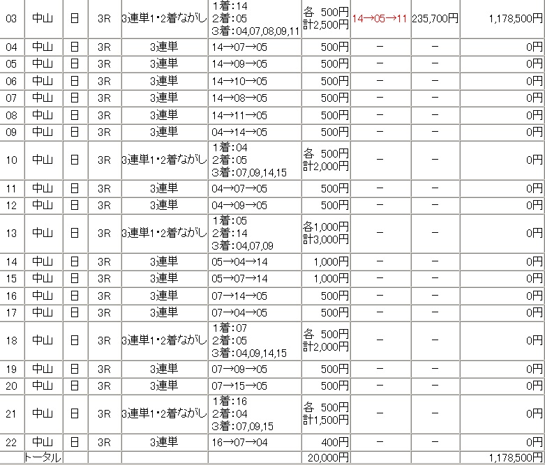 さてと・・・また4時半・・・私がこれを記載しているとき・・・外では新聞配達のバイクの音だけが聞こえる・・・それと・・・コンビニに納品に着たトラックのエンジン音か・・・・表題は過去にも書いたような内容だが・・・・これは大事な事だと思っているから・・・繰り返し記載したい。そう・・・すべての事象の回答は、顕在化し・・・我々の目の前で姿を現している。ただ・・・その正確な姿を、観測者である我々が捉えきれていないだけ。少しでも、顕在化している正答を得ようと思うから・・・私は結果に着目する。何度でも言おう。過程があって、結果があるという発想は結果を出した者の発想。まだ、結果を出そうとしている状態であるのであれば・・・結果から遡及すべきなのだ。結果から遡るように、過程を見つけていく。単純な言葉に置き換えれば・・・結果がすべて正しい。だから、結果を出している人の言動・行動はどれだけ荒唐無稽に聞こえようともすべて正しいという考え方だ。そりゃそうだろう・・・自分がその結果を出した者の言動・行動を荒唐無稽だと感じるからこそ結果が出ないのかもしれないではないか。基本的に我々は常に間違っている。間違っていなければ、他者が羨む様な結果を出しているはず。にもかかわらず、何故横一線の凡人のままか?それはつまり・・・何かが間違っているからなのだ。常識か、発想か、言動か、行動か、判断か、選択か・・・そのいずれか・・・もしくはそのいずれも誤っているから・・・・凡人を抜け出せない。で・・・天才になりたい凡人の私は・・・少しでも今いる領域から抜け出したいといろいろ抗うのだけれども・・・・もがいてゴム風船の内側から突き抜けようとしつつも・・・その弾力に弾き返されてしまっているような感じがするが・・・結局・・・天にわくわくありがとうの翁も・・・困ったことは起きないツイている変な人も・・・・一般的に普通の人には理解できない発想だ。でも、だからこそ凡人ではできない結果をだしているのかもしれない・・・竹田和平氏と斎藤一人氏検索すれば彼らがどれだけの手段(金)を持っているかはすぐに知る事が出来る。正直、どう穿ってみても羨ましいと言えるレベルだ。自分が羨ましいと思う結果・・・それこそが正答ってやつなのではないかと私は思うのだが・・・・とシリアスなスタートから本題へ・・・もう一度言おう・・・すべては顕在化されており、結果がすべて正しい。そう考えた時・・・・これをどう考えるか・・・・↓これこの馬券は馬券で勝ち続けているクイーンメリーでお会いした酒豪にして競馬で結果を出しているととさんの馬券画像。私がネタがない事に苦しんでいたら送付してくれた。これは先週の日曜日中山3Rで後輩が推奨していたレースで、後輩の予想にととさんがアレンジした物。見事じゃないだろうか?で、ちなみにこのときの私の馬券は・・・・↓同レースのN馬券これ・・・同じ20Kなのに・・・同じ後輩の予想と言う情報媒体を使用しているのに・・・・回収率のこの差・・・まあ、ターゲットといった近代兵器を駆使した一貫しているスタイルと・・・アナログのバンブーランスで戦う私では効率に差が出て当然と言えば当然だが・・・・さて、ここで考えたいのは・・・表題。そう、何度も言うとおり、結果がすべてであり・・・・正答は常に顕在化しているのだ。その前提で行くと・・・このととさんの馬券から何を読み取るのかだ。当たり前すぎるほど当たり前なことでもいい。どんな小さなことでも考えてみると意外なヒントになったりする。まず、20Kが1100Kになっているので・・・分かる事としたら55R連続で外れなければ負けはないということ。そして・・・これは以前にも記載したが・・・・ととさんはオッズで買わない馬券を決めている。何倍以下は買わないと言う取り決めだ。トリガミは回収率を著しく悪化させるとおっしゃっているので・・・この顕在化している馬券を見ると、人気馬の組み合わせがない物もあるはずだ。それが来たら仕方がないと言う買い方。そう・・・勝っている人間、結果を出している人間、20Kで1100Kを取れる人間はターゲットを使用し、トリガミ馬券を最初から排除している。これをどう受け止めるかは個々の自由であるが・・・少なくとも私は・・・結果を出している人間がそうしているのだから、それは正しいのだと。だから・・・これも繰り返しになるが、ターゲットを申し込んで近代兵器を手にすべきなんだろうと思っている。ただ、思っているだけでまだできていない。面倒くさいと言う魔物に骨までしゃぶられている状態だ・・・また・・・その予想の的中率を算出しているともおっしゃっていた。つまり・・・的中率10%の人が11倍以上の馬券を買い続ければ負けないとも・・・そのヒントを得たうえで・・・・この馬券を良く見れば、ヒントを得られるのではないだろうか。少なくとも・・・・す