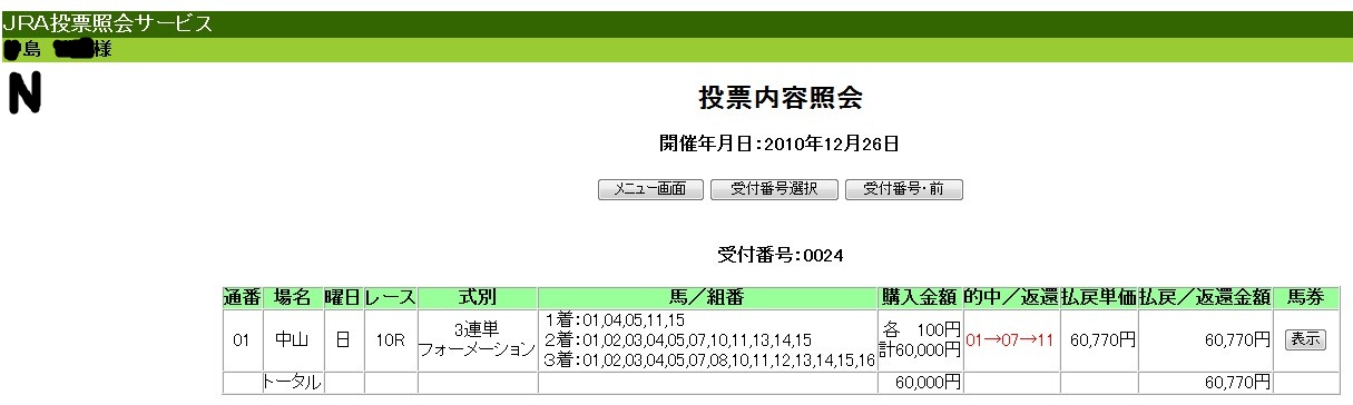 表題のどうでも良さそうなタイトルはちょっとしたSEO対策。さて・・・トリガミ祭りで面白くなかった今週の恥は感じないで済む唯一の馬券載せますかね・・・というか・・・買い方が下手すぎだ・・・・良く考えたら・・・有馬記念、後輩の印上位4頭のボックスで決まっているし・・・まあ、私の馬券はこれ・・・・全然だが・・・・結果論からいけば仕方がない。万が一ブエナビスタが坂で止まって4着だったら600Kの馬券なのだから・・・結果的に一番嬉しくない当たり方をしたと言えるだろう。ブエナがいなければなあ・・・トゥザグローリーが2着でも頭でもいいんだよな・・・むしろ、ブエナもペルーサもヴィクトワールもいらないのだが・・・まあ、ペルーサとブエナいなくなってくれればそれだけで大祭り・・・・一瞬中山の坂で伸びあぐねている感じだったんだけどなあ・・・・まあ、展開のアヤ一つで帯になったかもしれない勝負をして布石を頂戴しなかったのだから良しとしよう。にしてももう今後、トゥザグローリーは買えるオッズにはならないだろうし・・・・さて・・・結果から言ってしまえば、今週は買い方が下手だった・・・そして、有馬記念・・・後輩の挙げている上位4頭で決まったのに・・・0.1Kしか入れていない・・・・BOX買えばよかったなあ・・・・トゥザグローリーを入れたのは、優曇華さんの消しマークとはやとぅさんの無印もあったが・・・後輩の重い印とコメントが決め手。どうせなら何かの間違いで勝ってくれればよかったのだが・・・・まあ仕方がない。来年も後輩の予想から目が離せない・・・私がこれで借りた金で過去最高配当をゲットし一発逆転させてもらった後輩・・・我が優秀な後輩君↑http://blog.livedoor.jp/longshotm/対価出した後輩の予想ページ↑http://doronuma2.blog83.fc2.com/後輩で11連勝http://plaza.rakuten.co.jp/puchihametu/diary/201008160000/↑11連勝したとき・・・今年2度目の帯http://plaza.rakuten.co.jp/puchihametu/diary/201008290006/↑今年2度目の帯さて・・・・風呂は入った後に、今週の反省をしよう・・・