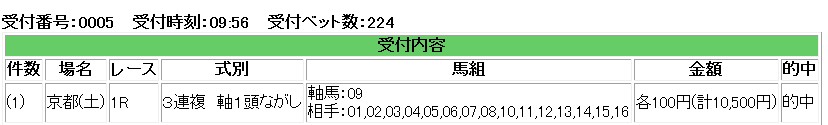 結果を考慮しての判断が正しいのか・・・極めて謎だ・・・まずは・・・目覚めて確認したらこれが当たっていた・・・後輩のコメント見る限り、自信ありげのようだったので・・・当然と言えば当然なのだが・・・他の私の買い方が酷過ぎる・・・・特に京都1R・・・恥ずかしすぎるこの馬券・・・・この世の終わりが続くわけだ・・・トリガミは俯きたくなるのであまり載せたくないが・・・これだけは自戒として掲載しよう・・・・あな、恥ずかしや・・・・何故に・・・単勝20倍の馬軸にしているのに・・・・しかもそれが勝っているのに・・・20倍?この世の終わりが近づいているとしか思えないくらい酷い判断・・・どう考えても買い方が悪い。馬良し、オッズ良し、騎手良しじゃないか・・・それは張らなきゃいけない所なのだが・・・麻雀の流れが尾を引いていると思い、当てにいったらこの仕打ち・・・違うよなあ・・・・と判断を過ち続けている・・・・ううむ・・・明日だよな・・・ちょっとこれから、明日の新聞を購入して検討だな・・・後ほど再度更新だな・・・にしても、買い方が酷過ぎる・・・もう一つもトリガミだしなあ・・・・トリガミってことは、最初から回答を間違えているということだもんな・・・数学の入試とかでいえば、1問目から間違っていて・・・・それ以降、全部間違いみたいなもの・・・・そうだよな・・・トリガミになるかもしれない馬券を購入してはならぬよな・・・スタートの間違いを修正しなければ・・・・