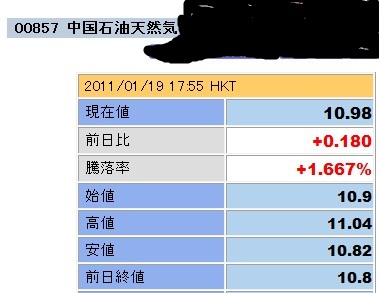 さて・・・たまには株の話。まあ、株で無敗と謳っているので・・・・それで来てくれた人もいたかもしれないけれども・・・・最近、ほとんど株の話しないしね。ちょっとだけ・・・多分、去年だと思うのだが・・・もうほとんど覚えていないが・・・・ペトロチャイナを再度有り金全部ぶちこんで購入した・・・ちょっと前の日記を見る限り・・・・9香港ドルジャストで仕込んだらしい・・・・で・・・現在の株価は・・・・ご覧の通り。いつ購入したかもう覚えていないのだが・・・・9香港ドルで仕込んで現在10.5香港ドル株も投機性がある以上ギャンブルだと思っているが・・・・16%くらいは株価上昇しているか・・・まあ相変わらず為替差損はすさまじいけれども・・・・ただ・・・個人的にはかなり楽観視している。人民元が過去最大価格をつけたらしい・・・だが、米ドルと連動している香港ドルにはその恩恵はまるでないけれども・・・・・基本的に世の中は道理どうりにしかならないもの。いずれ門戸を開かざるを得ないだろう、中国も。考えてみれば・・・第二次世界大戦が終わった直後の日本だって・・・とても信用できる代物を作っていたとは思えない。水俣病等の公害もそうだが・・・今の中国をあれだけ叩いているが、同じような事を日本もやってきたのだ。勢い、金、人・・・・すべてを考慮しても・・・中国が覇権を獲るんじゃないかと私は思っている。反日教育がどうこう言われているが・・・・時間の流れは想像以上に加速度的で・・・・・信用できない国が信用できるようになる日も来るかもしれない。ただ・・・考えてみれば・・・例え信用できずに騙されたとして・・・・・逆に騙されなかったからと言ってどうなるんだ?と。何も結果は変わりはしない。絶対に変わらない結果と、変わるかもしれない結果・・・どちらを選択するか?なのだ。ブログの冒頭に書いているように・・・たとえ10000Kあったとしても・・・・それを元手にどうにかしないかぎり・・・0とたいして違いはない。生活が何か変わるかと思えば、そうとも思えない。だから・・・私は、流れや勢い、歴史に学ぶ事実、自分以外へのメディアへの疑惑・・・・すべてをひっくるめて、自分の分析を信じよう。基本的に最初はどれも怪しいんだ。日本も一緒だったのだから・・・・仮に読みが外れたとして・・・・現状私に何が出来るというのだ。まったく魅力を感じないアンチエイジング状態の日本の株に張ったところで旨味はない。それだったら・・・呆れるほどの一貫性で、懲りずに中国株を保有し続けたい。私の目論見がヒットすれば・・・ペトロチャイナは伸び続けるし・・・香港ドルは人民元と統一され・・・・・株価良し、為替良しとなるはず。まあ、ならなかったら残念だが・・・・そもそも張らない時と同じ結果が起きるだけ。0%と0%と1%・・・どれを選ぶ?と聞かれているようなものだ。これで1%を選択しない奴がいるのか?と問いかけたい。まあ、何も変わらないなら・・・失う覚悟を持とうという事だ。桶狭間の時の織田信長のように・・・・死のうは一定。死ぬのは変わらない。そう、リスクを負わなきゃ何も変わらない。リスクを負っても何も変わらないかもしれないが、1%の可能性が存在しているかもしれない。それでいいんだ。大体・・・・日々を暮らすのに、僅かでも可能性を高めるために足掻いているじゃないのだろうか・・・もしそうじゃなければ早々に勝負の土俵を割っているような物。折角与えられている権利を行使せず、参加しないで時間を浪費するには勿体なさすぎる。私は誰よりも面白がりたいんだ。そのために必要な物、事を得るために抗う。このブログ一つ取ったって、可能性のための手段だ。とちょっと私もシリアスネタ・・・さてと・・・ギャンブル・・・・今日はまたもやサンマー・・・・で何をしても間に合わず・・・・-20K・・・・オイオイオイ、年明けて70K負けているよ、麻雀で・・・・まだ13日しか経っていないのに・・・4連敗でー70K・・・・・・なんだ、これは・・・間に合わないという暗示なのか?急げと。時間は待ってくれない、置き去りにされるという天啓なのか?だから急げと・・・・本当に酷い・・・何をしても間に合わない、打ちこむ、ツモられる・・・・どうしようもないと思える圧倒的無流・・・・やはり今週の競馬も注意が必要そうだよな・・・・そうだよな・・・・流されるように、何もせず、命の細切れである時間を消費していると・・・どんどん置き去りにされるよな・・・・中心は若い人間なんだ、それもとびきり・・・・中学入る頃からはもう中心から離れ始めているくらいに・・・・可能性は若さにあるか・・・・そうかもしれない。小学生までは時間が私にかまってくれていたかのようにゆっくりと流れていたが・・・・中学に入ることから、熱狂的なファンが関心を失ったかのように時間が私に無関心になったかのように感じる。