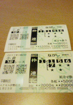 という馬券が当たりました・・・そしてやはりそそらないという感性の通り・・・・どうも違和感が拭えない・・・・そしてこれもあな恥ずかしや馬券・・・・それがこれ・・・330倍ついているのだが・・・それでもトリガミ・・・・ううむ・・・やはり買い方に問題があるのだろうか・・・・ひとまずは・・・勝負のレースはまだこれから・・・・シンザン記念の方だが・・・・ツルマルレオンとトキノゲンジに神の刻印がついている・・・・なるほど・・・そして・・・アドマイヤサガスとドナウブルーにはきっちり印が・・・皆の予想を見ると・・・どちらかが来てどちらかが飛ぶ馬券・・・・ふむう・・・・これは・・・両方来るか、両方飛ぶか・・・・それがありうるのではないだろうか?となると・・・・意表をついた馬を本命にしようか。どうも京都の馬場は前に行ったもので内の馬が残る特殊な馬場らしい。前に行く馬で固めたい。上がりかかるのに外伸びないという重馬場のような状態と暇井さんが言っていた・・・・なるほどね・・・・レッドデイビスいいような気がしてきた・・・だが・・・・テツさんの本命・・・・前回もこれしかないと思ったのに・・・・何故か来なかったんだよなあ・・・・意表を突いてマルセリーナが先行するという状況に張ろうか・・・・ちょっと迷っているが・・・直前に考えたい。さて・・・久しぶりに馬券を買いに行くか・・・