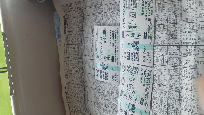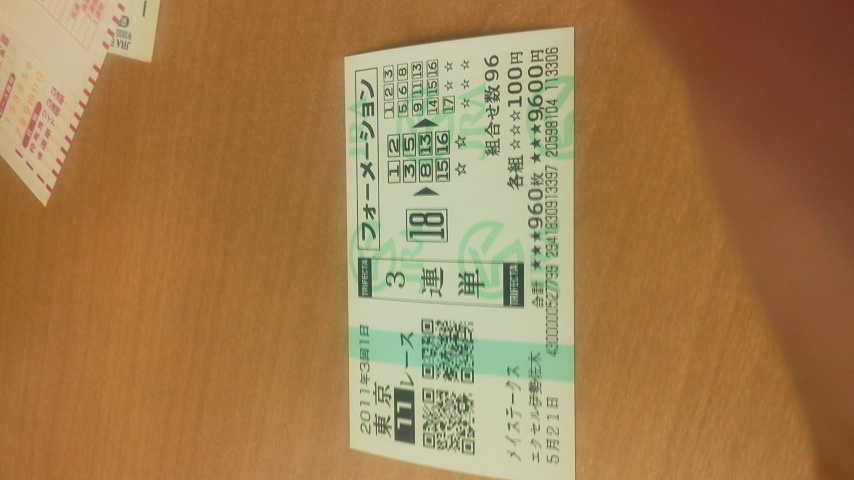 こっそり思っているのが・・・リンク先のれのせいさんは私にとっての幸運の神かもしれない。何しろご一緒する約束があるとき、必ずデカイ馬券当たるもんな。菊花賞のスリーロールスといい、今回の東京最終の帯馬券と言い・・・・・まあ、基本的に私宇宙一ツイている漢だしな・・・まずは・・・何度も更新したが土曜日の状況から。今年初の三鷹湖の矢牢http://plaza.rakuten.co.jp/puchihametu/diary/201105220000/↑今年初の三鷹湖の矢牢記載した通り・・・うずまきさんと暇井さんとエクセル伊勢佐木に競馬に行き、朝一から競馬。狙っているレースがないときは、張らないに限ると・・・私はほろ酔いアイスティーなんかを飲みながら自制していたのだが・・・そこはギャンブラー・・・後半の方に行くにつれ・・・上がるレート。土曜日の後輩は見気味で東京の7か何かは見事だった気がするが・・・・私は特別付近のレースが始まるまでは可愛い金額の馬券を買っていた。ただ・・・小気味がよすぎる外れなどを引き・・・穴を狙うとガチガチで・・・堅く買うと荒れると言う絶望的な状況下・・・・一応、新潟の8Rを勝負したかったのだが・・・・後輩が挙げていた馬馬はいいのだけれども、どうしても騎手が気に入らなかった。なので・・・・騎手を見てオッズがそこそこで勝率がそれなりの騎手を選択して3連単にしたら・・・的中も相手が堅くて絶句。騎手で嫌った後輩の挙げていた馬にも来られてさらに絶句・・・・それくらい厚めに買わなきゃだめだよなあ後輩が挙げているんだから・・・・で・・・↓其の的中画像がこれその後勝負レースもなく・・・自分の不才な感性で買っていたら・・・めくるめく可能性をまるで感じない外れの世界へようこそ状態。京都メインが終わった時点で・・・東京メインの10Kくらいの馬券と残金12K160K持ってきていたのに・・・こりゃ・・・本当に♪空を越えて~ららら♪状態飛んでアトム(ATM)に行かなきゃだなと思っていた。昆虫採集する金暇井さんに借りなきゃダメかなとか・・・ところが・・・東京メインで起死回生の逆転をかけて・・・・ちょっと前に大阪杯のときだったと思うんだが・・・後輩がダンツホウテイにそれなりの印を打っていたことを思い出した。其の記憶で・・・後輩が重賞でも勝負になると思っている馬が・・・横山騎手でしかもオープンで人気がない。まさに・・・馬良し、騎手良し、オッズ良しじゃないか。閃いた私はダンツホウテイから3連単を仕込んだ。これが見事的中し・・・正直・・・頭と3着の馬の人気が人気なので・・・かなり期待したのだが・・・・意外につかずに220K↓この馬券で・・・最終で大逆転をさらにと狙うも・・・新潟の最終は穴を狙って・・・残念な2着で3連単当たらず。東京の最終で一発逆転だと思っていた。このレース・・・後輩がそれなりに印を打っていたレース。で・・・逆転を狙うためには穴を狙わなければならないと思っていた。ただ・・・H氏からメールが来ており・・・H氏の本命が後輩とかぶっていたのだが・・・それが非常に嫌だった。来るかもしれないが・・・H氏は基本的に波乗り的に当たるときは立て続けに当たるが・・・当たらない時は不才な私状態其の日、まるでいいところがなかったH氏だが・・・最終の時にちょっと盛り返した感じもしていたが・・・なんとなく・・・きっとこれじゃ駄目なんだろうと言う気がしていたそのため・・・勝てる可能性のある騎手とオッズが期待できる馬それと・・・H氏とかぶったのだから・・・ここは後輩の対抗の馬から行こうと決めたそれで・・・・3頭1着固定のフォーメーションを塗りたくったのだが・・・買いに行く直前・・・感性が「違う」と私に訴えかけたのだ。まずはトイレにと思い、トイレに行くと・・・どんどん理由の分からぬ違和感と言うか、不安感があった。何かが違う・・・そう思うと、私は買う前に席に戻ってきた。そして・・・このままじゃ外れると感性が言っているので1頭追加すると言うと・・・暇井さんが消した中で1番人気のある馬を入れた方がよいと言っていた。もっともだと思ったのだが・・・それも違う感性はこれだと14番のホクトスワンを推した。東スポ上で調教師がやたら強気だったこともあるが・・・それ以上に、-14kgに惹かれた。この馬・・・休養前か何かに急に馬体重が増えていたので・・・変わり身があるんじゃないかと思えたのだ。何か変わるためのきっかけは存在している。それに・・・私がしたいのは逆転・・・・・買えない馬が来るから・・・馬券が外れて後悔するのだ。そして感性の言葉を信じないから・・・・その後悔が大きくなる。そう思い、無謀を承知で14番をフォーメーションの3着の欄に追加さあ・・・行こうと思ったが・・・また感性が囁いた。鼻差かもよ?と。私は・・・いるはずないが、たいして点数も変わらぬしひりつけるんじゃないかと思い・・・2着の欄にも14番を塗ったくった。そして・・・
