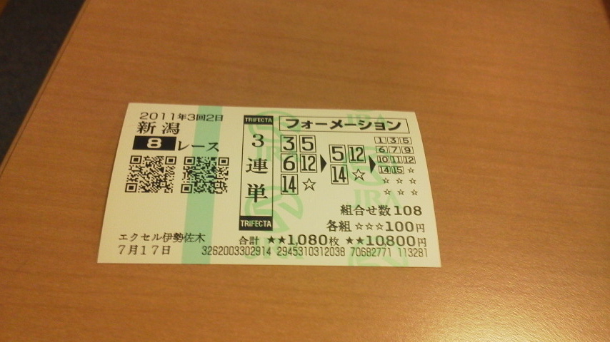 ♪負けてもやられても 挫けない♪♪鼻血のひとつじゃ 何か足りない?♪♪ザクザク 財宝 妄想したら♪♪ヨダレが止まらない♪これで分かったら、かなりの通です・・・さて、この歌詞の話をする前に・・・今日の競馬の結果から・・・まあタイトル見ての通り、今日は快勝で3週連続勝利の3連勝・・・いつもの後輩君・・・やはり夏競馬は巧い。私のストック馬にも入れていたのだけれども・・・・今日の大勝負は1Rだけ・・・それがこれ・・・2011年7月17日京都8Rマルカバッケン単勝3.6倍に40K 複勝60K これ、後輩が降級する前からかなり評価していた馬で、今日もコメントがあった馬。ただ、前走中舘先生から今回武豊騎手で・・・馬良し、騎手良し、買う直前はオッズ良し、厩舎そこそこ。人気が買う当初はなかったんだけれども・・・やはり「ととさん」のように巧い馬券師は分かるのだと思うのだ。後輩の予想の精度の凄まじさを。そして、やはり「くりりんの分さん」のような手練れで資金力のある方で後輩を信じている人がいるらしい。直前2分前に4.3倍でウハウハだと思っていたら・・・・終わってみれば3.6倍・・・オッズに影響を与えないように直前で買われていると思うんだが・・・いくら入れたんだろう・・・私が40K入れてもオッズまるで動かなかったのに・・・0.7倍動かしたってことは・・・・400Kくらい入れているとしか思えないんだよなあ・・・・でもって・・・今日は後輩好調で・・・・推していたレースも見事的中・・・ただ・・・後輩の本命対抗で決まっているのに、これは弱い・・・2011年7月17日新潟8R 3連単585倍おかしいな結構自信あったのだけれども・・・最も来てはいけない組み合わせで決まってしまった・・・・でもってこちらも後輩の本命が勝ったのに・・・儲かっているからいいやとベットを下げて後悔するパターン・・・2011年7月17日新潟10R3連単300倍ニシノステディー単勝オッズいいオッズだったんだけれどもなあ・・・・そして・・・最後に函館最終買ったら・・・今日の痛恨馬券の出来上がり・・・先週のウィキマジックに引き続き・・・またもや鼻差で400Kくらい取りこぼし・・・外れ馬券だけれども悔しいので乗っけます・・・岩田先生が乗る馬なんだから・・・鼻差どうにかしてほしかったなあ・・・・デカイ馬券ってほんの僅かなんだよな、獲れるか獲れないかは・・・・ステラホープが頭だったらド楽勝だったのになあ・・・いろいろ難しい。ステラホープ・・・今回ー16kgだったから買ったんだが・・・基本的に私は人気馬の馬体重の大幅変動は嫌うが・・・人気薄の馬の大幅変動は逆に買うようにしている。減ろうが増えようがだ。どうせもともと人気が無いんだし・・・何か変化が無ければ従来と変わらないだろうと思えてしまうのだ。人気馬は従来通りでいいはずなのに、変わると悪いと思うんだが・・・人気薄は何かしら変化がないと駄目。なので・・・3連単で買うときは人気薄でもなにか変化のある馬を積極的に買うようにしている。馬体重だったり、芝かダートの替りだったり、去勢だったりと・・・・人気薄は何か変化が必要だ。で、今日の馬券は当然のように快勝。まあね100K張った馬券が当たっているんだから・・・勝たなきゃおかしいよね・・・にしてもいつもながら後輩には惚れ惚れさせられる。相馬眼がすさまじい。我が優秀な後輩君↑http://blog.livedoor.jp/longshotm/対価出した後輩の予想ページ↑http://doronuma2.blog83.fc2.com/後輩での一貫性勝負結果集http://plaza.rakuten.co.jp/puchihametu/diary/201103060004/↑後輩での一貫性勝負結果集後輩での一貫性勝負結果集携帯から用http://blog.livedoor.jp/gyannburudedaihametu/archives/cat_60261152.html↑後輩での一貫性勝負結果集携帯から用(携帯電話から画像が見れます)でもって・・・先日東京で酒席をご一緒させていただいた「ととさん」がWIN5を的中されていた。ととさん2011年7月17日WIN5 的中 1880倍巧い馬券だ、巧く絞れているし・・・・やはり巧い人は巧いんだよな、当たり前だけれども・・・・そんなこんなで・・・前日の逆風を払しょくしたので・・・12R終わると直ちにホールへ。最初に打った秘宝伝が投資3Kで強チェリーからも何も起きず。前日高設定で、何となく翌日据え置きそうだなと思っていた台が・・・私の目の前でボーナス合算で22回で総回転数4300回転で空いた。当然のように移動すると・・・投資1Kで斜めスイカからB・・・でもって・・・ボーナス中にピラミッド揃えて高確率に行き、一発ツモ・・・も・・・完全単発で抜け・・・ところが・・・その後子役RUSHから・・・右下のクレアランプがペカリ・・・これ伝説モード確定だと思うんだが・・・・ロング確定なんですかね・・・知っている人教えておじいさん。で・・・勝手にロングだと思いこんでいたら・・・1回目の高確率で引くも・・・まさかの逆はさみしたら、ART押し順間違えで取りこぼし・・・何やってるんだ私は・・・・で・・・その後伝説中に高確率引けなくて
