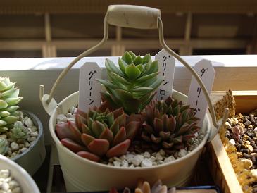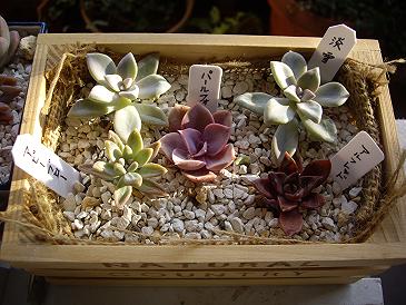 こんにちわお久しぶりです。みなさまお元気でしたか?ちょーど2週間程休ませてもらいました。しかし、まいった 今年、初めてひいた風邪でこんなに寝込むとは・・・。もう体はフラフラ いつも食い気だけは誰にも負けない私も、食欲もなくご飯が食べれず、ほぼ2週間こんにゃく畑とりんごジュースで生きていました。米なんて、もうたべれません おかげで、ほっそりした体になりました。嬉しいのやら、悲しいのやら今だに、食欲もなく1日1回ごはんを食べるのが精一杯・・・。おやつなんて・・ケーキなんて・・。大好きだったのに今じゃ、何をたべてもおいしくな~~い大丈夫か?と自分でも思う・・・。あの後、37.8度が1週間続いて体中が痛くて、寝てるのもしんどくて・・・・大好きな多肉ちゃんにも触れられず、ほんとにしんどかったよ~~私が寝込んでる間、子供達も体調を崩してしまい、2人共、学校休んでましたでも、長男(どんちゃん)長女(P-ちゃん)はよく、お母ちゃんを助けてくれました。感謝ですほんとに、あんたたちには、めんぼくね~~!!こんなお母ちゃんで許してくれ・・・。やっぱり、子供はいいな 今まで、育てるのは、大変だと思ってたけど、こんなにも一杯助けてもらってるよ~~。ありがたいっす!!あっっもちろん、おとうちゃんにも・・・。まずい食事を作ってもらい・・・。ははは気がつぃたら、結婚して初めてかも?お父ちゃんに頼ったの・・・。いつも、仕事でいなかったお父ちゃん・・・。ほぼ、わが家は母子家庭だった。P-ちゃんが赤ちゃんの時、呼吸が止まり、救急車で運ばれた時も・・・・。P-ちゃんの病気がわかり、長期入院をした時も・・・。私はいつも1人だったお父ちゃんは仕事でした・・・。正直、恨んだ事もある・・・。そんなに仕事が大事か・・・でも、そんな事、考えてる余裕もなかった。それぐらい、P-ちゃんの事で必死だった。むろん、どんちゃんには、いつもさびしい思いをさせてた。だから、彼は、すごい我慢強い男だ!!そして、何より1番私が頼りにしてる男だ!!キャ~素敵 どんちゃんそして、いつも私の事を助けてくれる男だ!! かっこいい~~お父ちゃんには、悪いが・・・。しかし、今回は、初めておとうちゃんにもお世話になりました。ありがとうっって言っておこう!!ははは・・・・・。あっっそんなで、私が倒れてる間にもbisui・y・nさん から、お肉便が届きました~~。ありがとうございます!!中身を開けて、びっくりきゃ~~ぷりぷりの元気な多肉ちゃん達です~~。それに、こんなに一杯です!!きゃ~~あ~~ざ~~すもぅ、大事に大事に育てますね~~ちゃっと、かわいい多肉ちゃん見てたら、めっちゃっっ元気になってきたわ~~。ではでは、紹介です~~ はい!植え替えました。かわいいですね~~。うふふ