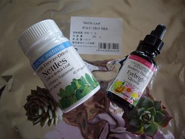 こんにちわ!!みなさまの暖かいお言葉ありがとうございました。待っていましたよ!!のお言葉に感動でした実は寝込んでる時、とても孤独でさびしかったんだいつの間にか、2月から3月にかわってて、極寒から暖かい春に・・・。なんだか、とり残された気分だったんですでも、みなさまの暖かいお言葉に励まされて ジャンジャジャーン 復活いたしました!!これからも、みなさま末長くよろしくお願いいたします!!これからも、がんばってブログを更新していこうと思います!!はい今日のネタやはり春だから、花粉のネタでいこ先日、ねねこさんの所で話題となった ネトルちゃんです~~♪そうです。そうです。 ここにいます!!ジャーーン♪わが家では、このセットは、もはやこの季節必需品です 上の写真のアルミの袋の中には、ネトルの葉っぱが500グラムはいってます!!冷凍して、保存します!!まず、ネトルのカプセル、これはネトルの葉がぎっしりつまった1品です。毎朝1~3錠ぐらい飲むと鼻水ぴたっっととまります!すごい即効性があります。かなり、優れものです!!続いてアイブライトこちらはチンキ剤です。朝、1、2滴 ピピッと水で流しこみのです。そしたら、目のかゆみに効くみたい。こちらは只今、お試し中です。そして、ネトルティーです。チョイチョイ この500グラムをのみほします!!この3つがわが家の花粉対策の必需品です。ちなみに、近所のママともに教えてあげたら、みんな買って、よく効くっって大好評わが家の近所ではネトルが流行だしております~~!!もちろん、お子様から~お爺ちゃん お婆ちゃんまで安心してお飲みいただけます~~。花粉症でお困りのあなた!1度お試しあれ~~はい今日の多肉ネタ寄せ植えちゃんから~~。 そし、最近とっても好きになってきた、月影ちゃんです~~。 続いて、今日の多肉棚~~ ケッセンリンギアナちゃん かなり色白ちゃんですね~~。 ミニベルちゃんです~~。 アモエナちゃんです~~。そして、最後にニクサーナちゃんと紅稚児ちゃんです~~。すっごい、ニクサーナちゃんがぷりぷりで、大好きです