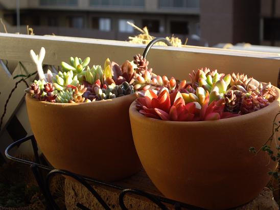 こんにちわ~~。今日は昼からでしたよ~~~。でも、朝、ゆっくり寝てから、ベランダでゴソゴソしてました。アイビーの植え替えをしたり、多肉ちゃんの植え替えをしたりベランダの掃除をちょこっとしたり、なんでっって??ふふふ・・・・・それは、ベランダのテーブルセットが届くからなのよもぅずっと探していたんだけど、なかなかいいのに出会えなくて、やっっとやっとで探して出会えました。うれし~~~い早く届かないかな・・・・?????待ち遠しいです~~~。また後ほどアップしますね♪♪さぁさ今日の多肉ちゃん!!いつもより上機嫌のぷくぷくです~~~~あ~~。P-ちゃんのクラスの件ですが、ご報告まだでしたね~~。大丈夫でした。とてもいい先生についていただき、お友達もP-ちゃんと同じくらい天然の子が一緒で、仲良くしていただいてます!!よかった。よかった。P-ちゃんが言うには、1番仲良しのお友達と離れてしまい、少しへこんでいますが、休み時間には、会いにきてくれるそうです。よかった。よかった。これで、2年間は安心です~~。そしてそして、どんちゃん!!なんと奇跡が~。6年間親友と一緒でした~~~。乱暴な子達とも離れ、穏やかな落ち着いたクラスです。よかった。よかった。なので、最近のぷくぷくは上機嫌です~~~!!うふふ♪後は2人とも勉強してくれ・・・・・。勉強・・・。頼むよ子たちさ~ではでは多肉ちゃんいってみよ~~ 緑色の真ん中から時計周りに、グリーンローズ、ダーリーダール、グリーンレディーです。なんだか緑色っぽい子たちです。 パウダーブルーちゃんです。大型のエケちゃん?けっこうお気に入りです。 この子はなんだったけ?名前忘れてしまいました。 こちらは、セダム寄せ植えです。春もえ、ロッティー 白ぼたん トレレアシー スノージェイド 乙女心 少し、ぷりぷりに大きく育てたいから、培養土結構まぜました!!大きくなるのが楽しみです!!そしてそして、みなさん待ってた? 題名どうり、ベランダ右半分大公開です~~!!今日は曇りと雨だったから、画像暗いけど、見てちょーだい!!はい ど~~ぞ