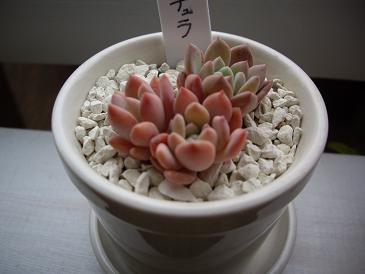今日も天気で1日お肉日和昨日お父ちゃんに「家 汚い!!」って言われたから、久々、お布団干して、家中風通して、掃除機、ぞうきんがけ(もちろん水にユーカリのオイル混ぜます。)と空気中の殺菌、エアーフレッシュナーをして、(これもユーカリのオイルを使って手作りです。)なんだか、さっぱりして、どないやきれいやろーと言いたくなるぐらい、がんばった けど、この綺麗さも何時間もつのだろう・・・。お子たちが帰ってきたら、一瞬だろな~~。ははははい今日の多肉ネタ今日はかわいい系でいきましょうかまずはピンク色のプラチェラ、この子好きこのピンク色でいて、ぷりっとしたかわいいお姿、まるで私はっはっは・・・。すみません。 続きまして。フーケリ。このブルーなお色がたまりません。 やっとほんのり色づいてくれました。