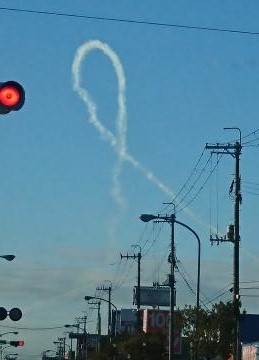 21012017信号待ちしていると松島基地から発進したであろう練習機が見えたジッと見ていると宙返りを開始して飛行機雲の航跡が見えるしかしあまり上手でないループかもしれないか?まぁチョクチョクこう言うのは結構見かけるが撮影できるのはあまりないな大概は運転中だからなので当然だな基地付近を走っていると直上を飛行機やら輸送機やら大型ヘリが通っていくのは驚くやら感動するものがあるなあんなでかいのが飛んでると思うと不思議なもんだ編隊を伴って飛んでいる時もあるのでまた次回も見れたらいいな。お囃子は(V)o¥o(V) バルタン