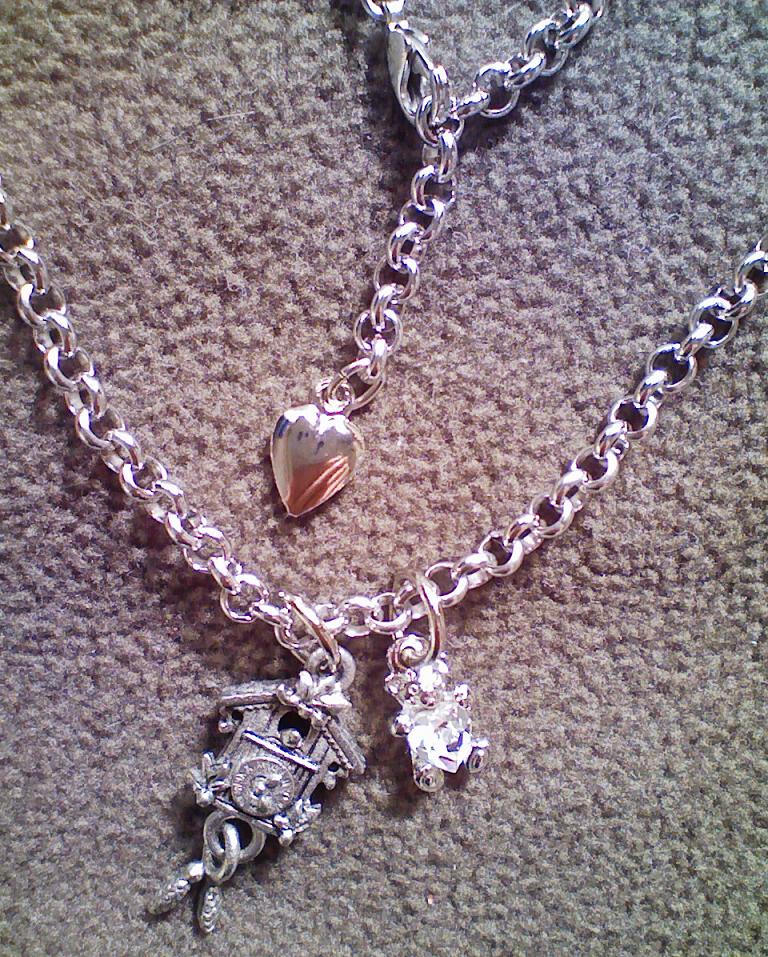 掛け時計(?)とハートモチーフのスワロかクリスタルかジルコ?か何かの石(適当・・・)を持ったクマのチャーム付き。