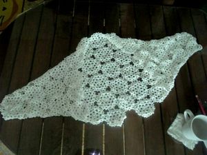 やっとこさ写真が撮れました~モチーフ編みをつないで、マーガレット的ボレロ これは、脇をボタンでとめていて、全部はずすと、こうなります。 だから、ショールにもなるし、ひざ掛けでもいけるし、コットン&ポリエステル糸なので、赤ちゃんのおくるみみたいにしてもイイと思う~…うちには赤ちゃんはいませんが。。。 娘がイヤイヤながらも着てくれたので、載せちゃうこんな感じです。 顔、写ってないよ~大丈夫~