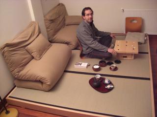 この秋、居間に登場したのが畳です。新居に家具など揃えるのも長期戦、スローライフを掲げる我が家では、気長にゆっくりと家具や電化製品を揃えていきます。テレビがなくても別に日常生活に支障はないので(ネットで情報が入る)、今のところ購入予定はありません。テレビより大事なもの:靴と床生活の中で欲しかった、体と心のリラックス空間。居間の多目的空間。ソファーではどうしても限られてしまいます。ゴロゴロと寝転がったり、お昼寝したり、足を伸ばして座ったり、色々な姿勢で本を読んだり、お茶を飲んだり、おしゃべりしたり、お客さんへのおもてなしも出来て、お客さんのお泊りもOK。プレの実家からの結婚祝いのお蔭で、思い切って畳を購入するに踏み切れました(感謝っす)。なんか昔の嫁入り道具みたいっすね、桐ダンスでなく、畳3畳が嫁入り道具・・・。更にクマさんも畳購入に妙に積極的だったこともありますか・・・。クマさんは日に日に囲碁オタクになりつつあるので、畳で囲碁をしたいということもあり。こちらで売っている畳は台湾製で、畳一畳が大きめと小さめのものと二種類選べました。プレ達のは、お客さんが二人くらいその畳で寝泊り出来ることを配慮し、大きめのものに。湿気防止の為に、畳は床に直にでなく、ベットと同じく木の枠組みの上に置きます。畳セットが送られてきた時、木の枠組みはIKEAみたいに自分達で組み立て。しかし、ここのIKEAと同様、お店が木の枠組みのサイズが違うのを間違って送ってきたので、今まで色々ありました。さすがエスパーニャというか・・・日本人にとっては、あの新しい畳のにおいこそが極上ものなんですが、こっちの人って「あー何これ!?、においがこもっちゃって換気しなくっちゃダメだよー!」そう、この香りは分かる人と一緒に楽しみたいものです。でもエスパーニャ人でも関心ある人はあるみたいで、クマさんとお友達夫婦に畳の話をすると、後日育児や子供の教育上の理由から本当に畳を購入しました。畳は夫婦の寝室に置いているらしい。何やら心理学専攻だった奥さんの方が、日本の育児についての記事を読んだらしい。日本では赤ちゃんは両親と一緒に川の字になって寝る、その方が赤ちゃんにとってもお母さんにとってもいいのだ・・・と。ちなみに、こっちの布団は、体操マットみたいに分厚いので、押入れには入れられません。普段は三つ折りにして、ソファーみたいにしています。これで冬にコタツと小型コンロとお鍋があったら完璧!ちなみに、以前マドリードでタコ焼き器の型を購入したのですが、未だ一度も使っていません・・・。