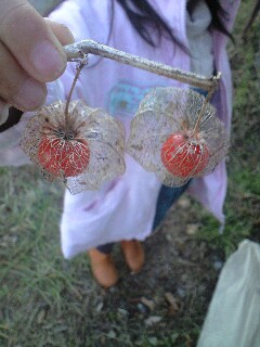 お散歩の途中でこんなにかわいらしい物を拾いました。周りだけ枯れてシースルーになったほおずきのふた子。「この子に会えて良かった~(^-^)」と満足そうに下げています。栗は1.5センチくらい。2センチ程の松ぼっくりも拾いました。
