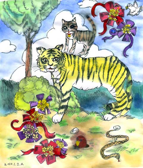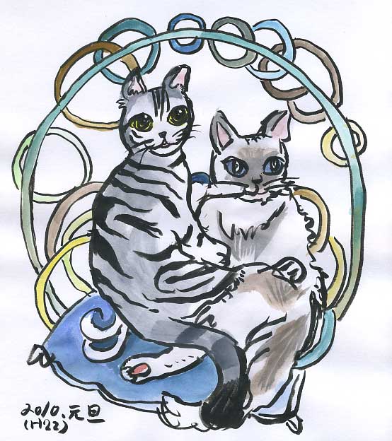 新聞の折込チラシに虎の絵や写真があったので寅年なので虎の絵が描きたくなりました。虎だけでは寂しいし可愛くないので、虎の仲間の猫も加えました。輪郭は、Sun-Star製のゲルインクボールペン(水性)で描いたので滲みがちで、黒っぽくなったところもあります。色塗りは、ペリカン固形透明水彩です。所要時間:2時間30分