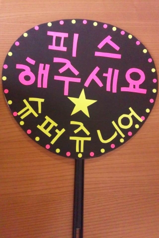 2月にsuper juniorという韓国のグループのコンサートにいくので応援うちわを作りましたこれ↓ピンクの文字は「ピースしてください」ってかいてあって黄色い文字はスーパージュニアってかいてあります辞書で調べたけどあってるかな?裏面はちょっとおもしろくなってるけどそれは今度見せます今は一緒に行く次女用のうちわ製作中