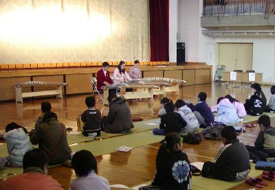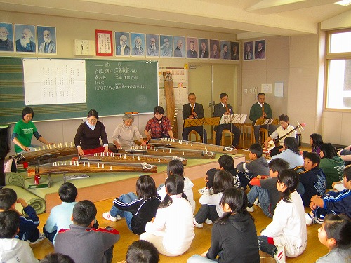 今日は、とある小学校の6年生の「音楽鑑賞教室」にお邪魔してきました。1 校歌をアレンジ2 六段の調べ3 春の海~体験コーナー~(箏や尺八に触ってもらいました)4 たきび5 よろこびのうた(宮田耕八朗作曲)6 ぽんぽこりん(松坂尚子作曲)7 宙船(そらふね)Koto ver.8 千の風になって 箏バージョン6年生ということもあって、みんな静かに聴いてくれました。体験コーナーのようすです。想像以上に糸(=絃)がかたくてびっくりしたようです。尺八は、音がなかなか出なくて頭がクラクラしたとか。最後に演奏した「宙船(そらふね) Koto ver.」は、子供たちもちょうど吹奏楽で練習中とのこと。「わたしの大好きな曲です」って紹介しているんですけど、子供たちも、自分たちが演奏している曲が箏で聴けてびっくりしたみたい。幅広い世代の人から愛される曲になってくれて嬉しいです。トークはぐだぐだでしたが(苦笑)、こういう場を作っていただいた皆さんに感謝です。町内に小学校は11校あるのですが、全校制覇したいですね。