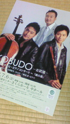 予告どおり、母と妹と古武道のコンサートに行ってきました。KOBUDO-古武道-とは、チェロの「古」川展生さん、ピアノの妹尾「武」さん、そして、尺八の藤原「道」山さまのユニットです。恥ずかしながら古武道の存在を知ったのは今年の春でしたが、尺八の藤原道山さまとは先日の共演をはじめ何度かご一緒させていただいていたので、お会いできるのを楽しみにしていました。一週間ぶりの道山さまは、相変わらず爽やかなお方で、トークも素晴らしくて、謙虚で、何度もハートを射ぬかれました古川さんは、先日の地震を心配してくださいました。妹尾さんは、桜の季節に北上にまた来ることを約束して下さいました。初めて聴いたチェロ×ピアノ×尺八の音楽。それぞれの音が個性を発揮しながらも、絶妙に溶け合って素晴らしい音が生まれていました。開演前に投票が行われた「リクエストコーナー」では、わたしと妹がリクエストした「Fly me to the moon」が選ばれ、嬉しかったです何でも唱歌は人気がないようで、まだ一度も演奏されたことが無いとの事。「浜辺の歌」も聴いてみたかったんですけどね~残念ネタバレになるので他に何を演奏されたかは会場でのお楽しみですが、期待を裏切らない素晴らしいコンサートでした。そしてそして、終演後にCDの購入者限定の握手会も行われました道山さまの「壱」を買い、3人で並びました。道山さまには、「ちょっと早いですが、誕生日おめでとうございます」と言うことができ、妹尾さんには、箏を弾いてることを言うと「頑張ってください」と励まされ、古川さんの手は、大きくていつまでも握っていたい感じでした(笑)。サインをいただけなかったのは残念でしたが、握手会が開催されてヨカッタ本当に最高に贅沢な二時間でした。