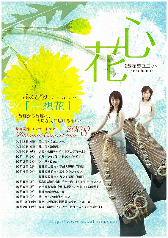 芸術の秋にぴったりなコンサートのお知らせです。 東京藝術大学出身の二人からなる25絃箏(こと)ユニット 「心花~kokohana~」が、5枚目のアルバム「一想花(ひとおもい)」の 発売を記念したコンサートを紫波町で行います。 「心花」という名前は、聴く人の心に花が咲くような音楽を届けたいという思いから命名されました。 その名のとおり、和楽とポップスが融合したピュアでやさしい音色が注目されています。 お二人は一昨年「マザーウォータープロジェクト」のPRのため紫波町を訪れたのが縁で、今回のコンサートが実現しました。 紫波をイメージした楽曲「紫音」も演奏されますので、ぜひお越し下さい。 【日時】平成20年10月6日(月)午後6時開場 午後6時開演【場所】野村胡堂・あらえびす記念館 【チケット】一般 前売り2,000円 当日2,500円 ※協力会員 前売り1,500円 当日2,000円
