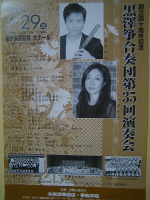 報告が遅くなりましたが、「森の会」の第49回定期演奏会に行ってきました。「森の会」とは、東京藝術大学(つまり「芸大」ね)を卒業した生田流の糸方しか参加できないという、大変ゴージャスな会です。芸大の卒業生(ご年配の方もいらっしゃいますが)が一同に会しての演奏、とっても楽しみにしてました。【プログラム】1 三つのパラフレーズ2 情景三章3 三絲遊奏4 装画5 物は尽くし6 二つの群の為に作曲者は、すべて沢井忠夫先生。最後の「二つの群の為に(通称:二群)」は奥様の一恵先生も出演され、超ド迫力でした。先輩たちが始めて全国制覇を成し遂げた曲であり、後輩たちが苦労を乗り越えた曲。思いもひとしおです。一恵先生のソロもカッコよかった。最後に柱が二個飛びましたが(笑)、まぁそういう曲ですから。ゲストの藤原道山さまもカッコよかったなぁ~そして、打ち上げはゴージャスだったろうな~。正直混ざりたいくらい(オイオイ)でした。次はいつプロの演奏を聴けるかな~?