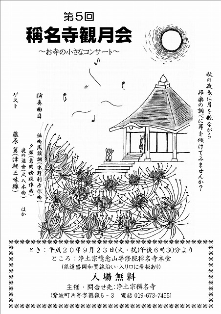 ようやく、第5回観月会のようすをアップしました。9月23日の日記に書きましたのでぜひご覧下さい。写真、住職が撮影したフィルム写真をデータ化したものなので、ちょっと画像が濃いですが。あと、顔がわかんないように敢えて小さい画像にしてますのであしからずです。