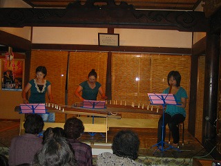 おかげ様で、第5回観月会は無事に終了しました。【プログラム】1 花かげ変奏曲(野村正峰作曲)2 三段の調(久本玄智作曲)※親子での演奏3 かっこうワルツ(安武慶吉作曲)※小学生3人とアタシ(17絃)4 夕顔(菊岡検校作曲 八重崎検校箏手付)5 地上の星(中島みゆき作曲)見にくいかと思いますが、昨年に続きベースとパーカッションでの演奏。アンコールが来るなんて思わなかった来年は、ちゃんと用意しときます6 鹿の遠音(尺八本曲)7 さらし風手事 紫舞ver.(宮城道雄作曲 紫舞編曲)昨年「わいわい」で演奏して爆笑の渦を呼んだ「"恥"さらし風手事」を名前を変えて。ウケたが柱は飛ぶわ調弦は間違うわで散々リベンジ希望です。8 藤原翼さんの津軽三味線ステージ5周年記念の今回のゲスト、地元在住の津軽三味線奏者の藤原翼さんのステージ。お客さんのノリもよく、楽しんで演奏していただけたようです9 編曲民謡調(水野利彦作曲)今年は大きな地震が二回あったので、復興の意味を込めて巷で話題の「元気です岩手Tシャツ」を着て演奏しました。最後は、アンコールで出演者全員で炭坑節を。お客さんにも歌っていただき、盛り上がりました。去年もそう思った気がするんですが、毎年楽しくなってきています。毎年楽しみに来てくださるお客さまに感謝、朝から「夢明かり」をするための竹を切ったり、ステージを作ってくれた尺八のおじ様方にも感謝。打ち上げのために新鮮なお魚を持ってきてくれる元魚屋さんにも感謝です。ここでお知らせ。来年は5連休の二日目。9月20日(日)に開催いたします交通費は出ませんが宿と食事の世話はしますので、遠方からの参加も大 歓 迎 たくさんの方のご来場をお待ちしておりますので来年もよろしく騙されたと思って(笑)、ぜひ一度お越し下さい。