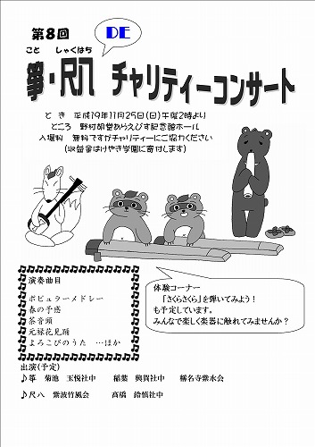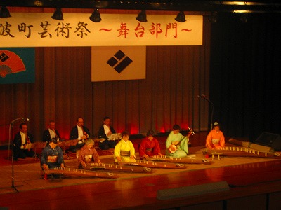 今日は、ミニコンサートで子供たちの前で演奏してきました。1 よろこびのうた(宮田耕八朗作曲)2 ぽんぽこりん(松坂尚子作曲)3 宙船(そらふね)Koto ver.(中島みゆき作曲 箏独奏にアレンジ)を演奏しました。宙船はわたしの大好きな曲なので、箏でやってみたいと思い、独奏曲にアレンジしました。まだ練習中なんですが、弾いていて気持ちがいいです。子供たちも、初めて見る楽器に興味を示してくれ、楽譜を覗いたり(演奏中に!)、終わったら楽器に触りたがったり。また、今日のコンサートは二本立てで、後半は津軽三味線の演奏でした。演奏者は、町内に住んでいる18歳の男の子。噂には聞いていたんですが、初めてご一緒でき、演奏を聴くことが出来て嬉しかったです。さて、明日は町の芸術祭舞台部門です。昨年に引き続き、わたしたちの演奏しているようすがポスターに起用されました。明日も気合入れてがんばっていこ~!