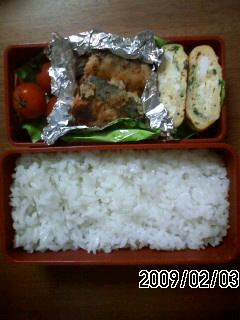 の冷凍鮭チーズの香草焼きに、定番「シラスとネギの玉子焼き」、プチトマトです。