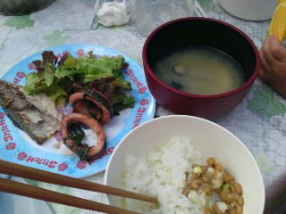 エビの頭からとったダシで作った「しじみ汁」やら焼き魚にベーコンエッグ
