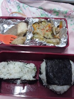 一昨日の夕食に作った野菜ラーメンの具(野菜炒め)とオニギリ2つです。オニギリは、朝結びましたよ~