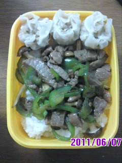 お弁当はこんな感じに炒め丼に冷凍食品のシューマイだーん(^O^)