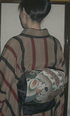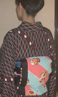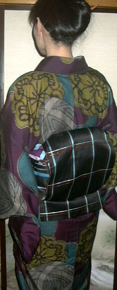すごく気に入っている訳ではないのですがこの着物、相当着ました。紫、立涌は好きですがこの変な四角は無くていいんですけど。ネットで買いドライクリーニングして度々着てさらにドライクリーニングしてまた度々着ました。私の場合アンティークでもちょっとお高く買ったものや季節が限られるもの・生地が弱りかけているものは着用頻度がどうしても少なくなってしまっておりますがこれはホント着たな~。という感じ。軽くしなやかで気易いし仕立ても縫い目が綺麗。表とのつり合いも全く問題なし。難を言えば染め難が結構ある事と自分サイズで無い事かしら。お太鼓ブヨブヨ(ーー;画像で見てあんまりなので引っぱって直しましたけど~。