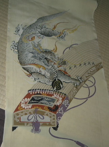 風邪が治りきらないのか どうも調子はイマイチで今日は頭痛がひどいです。明日は久しぶりに洋裁に行く予定なのですが何を作るかもまだ決めていません。仕立てようか悩み中の帯。もう5年程前になるでしょうか?(^^;気に入って中古で買ったのですが汚れが気になって解いて洗ってみました。2度洗いましたが汚れは落ちませんでした。柄がかなり大きいのでお太鼓は柄全部出ません。帯を作る時は出来れば4、5本は続けて作りたいのですが今の所は仕立てたいのがあまり無いですので仕立てるにしても大分先になるのですが・・・