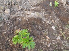 去年植えた「明日葉(あしたば)」が新芽を出しました。手前の方が去年植えた「あしたば」です。小さい方がきのう植えた新苗です。新苗です。「あしたば」は古くから不老長寿の野菜といわれています。"今日芽をつみ取っても明日には新しい芽が出てくる"ということからこの名前がついたと言われています。ちぎったときに出る汁は抗酸化作用の高いフラボノイドで、ガンの予防薬として役立つということで注目され研究が行われている野菜です。じゃがいもを植えている様子の続編です。これは男爵イモです。調理のときに煮くずれしにくい点が長所のじゃがいもと言われています。半分に切った種イモの切り口を下にして植えます。今年は各畝に黒のマルチシートをかぶせたので去年悩まされた雑草の問題が解決できそうです。参考資料: 「イキイキ! 食材図鑑」(日本文芸社 ← 写真をクリックしてご覧ください。 ← ランキングクリックをお願いします。にほんブログ村
