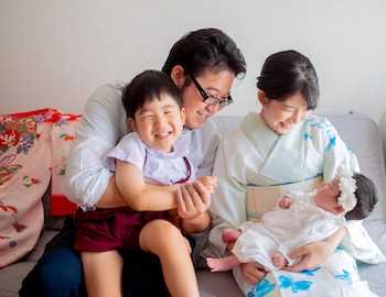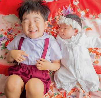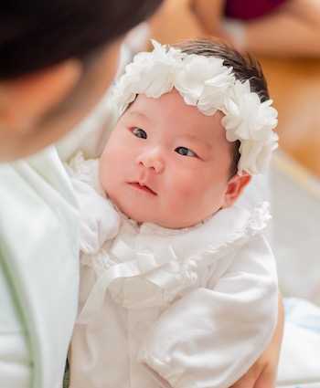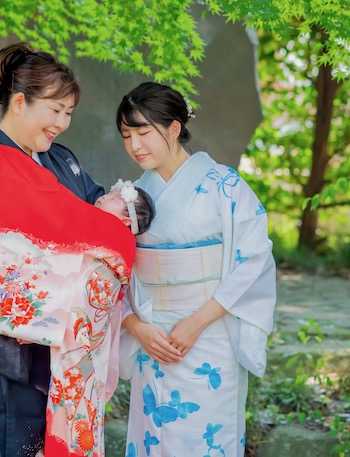 赤ちゃんに掛けている祝い着は
