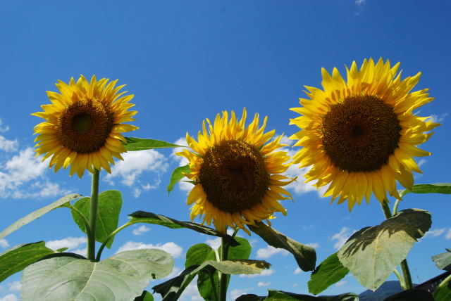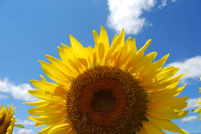 この猛暑ではさすがのひまわりも空に向かえないwwでも青空にこんなに映える花はあんまりないと思うな~。これは少し変わったひまわりでした♪♪♪
