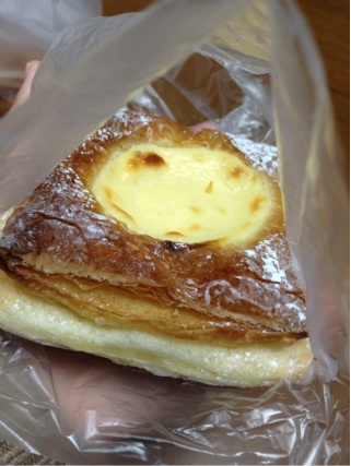 近所にパン屋さんができたので・・・前々から気になっていたけれど行けなかったので学校帰りに行ってきました♪土曜日の話なんだけどね♪ひとつ目がこれ!袋から出して撮れば良かったんだけど・・・みにくいかもしれないけれど、これがチーズケーキパンって名前だったかな・・・??真ん中がチーズケーキになってるんですよ外はパリパリしてて中はチーズケーキとってもマッチなパンでした美味しかったですよこれがアップルパイ真ん中に大きなりんごが美味しいアップルパイでした全商品105円っていうのはグッドですねこの店のパンを全制覇したいものです
