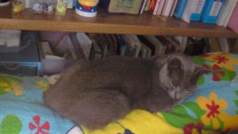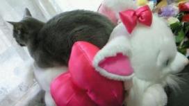 今回もまた、違うところで。 娘の部屋のマリーちゃんの背中でくつろいでいました。 そう言えば・・・ いつの間にかマリーちゃんの背中が平らに・・・。