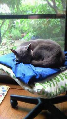 いつもの所にいないと思ったら、 娘のベッドの足もとのクッションの上で寝ていました。 ブログ用の写真を撮るようになって、 こんなにも、移動してるかと驚いています。 それに引きかえ、トッポは・・・ 今も、相変わらず、パソコンの横で寝ています。