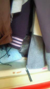 どこにいるのかなぁ~と、 各部屋、ベッドの上、下、ネコタワー 押入、キティのクッション・・・ 心配するほど捜したのに・・ まさかと思い、 ちょいと服をめくってみたらこんな所にいました。 でも、見つかってしまい、 雛のイヤそうな顔!! 写真を撮ってる間にどこかへ・・・ なんだか、かくれんぼの鬼の気分です。