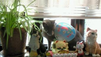 突然、出窓の所にトッポが来て 置物と、窓の間に入り込みました。 落ちて壊れたら嫌なので、真ん中を片づけたら さっさと、どこかへいちゃいました・・・。 もう~、トッポったら~!