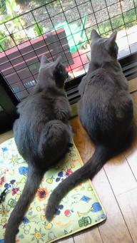揃って外をみてるのですが・・・ 何かいるのでしょうか・・・ もしかして、トカゲ? さっき庭にいたし、それかな~?