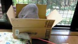 おお~ ・・・ あれ~? あれれ・・・ ??? 段ボールの箱は絶好の遊び場です。 手が出せるほどの穴を開けてみました。 一生懸命さがしてますが・・・ 最後、舌がペロッと出ているのが可愛いかも・・・。