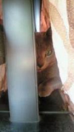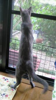 一生懸命背伸びして、何か見ているようです。 キョロキョロしています。 トッポの先には スズメが、ちょこちょこと庭を歩いていました。 一度、ベランダでスズメを捕まえたことがあるんですよ。 すぐ気づいたので、逃がすことが出来き、 元気に飛んでいきました(^0^)