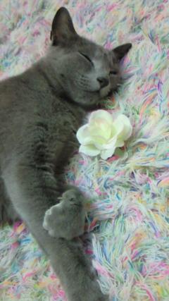 娘の部屋でごろり~ん 昨夜はバラの花で遊んでました。 部屋の飾りで付けていたのですが・・・ 気が付けば、あちらこちらに花が落ちてます。 バラをくわえてフラメンコでも練習してたんですかね!