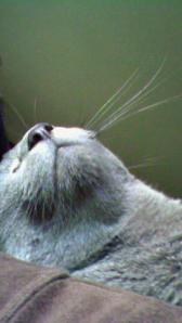 何ともいえない顔です! トッポは、よく背中や肩にのってきて ごろごろと甘えます。 爪切りを忘れると大変です。 落ちないようしっかりつかむので痛いときがあります。 また、この角度の写真て難しいですね~。