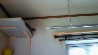 猫さん用、遊歩道造ってみました。 特に、トッポがお気に入りで、よく寝ています。 その下でパソコンをやっています。 時々、上から、ニャーンと鳴くので、 背中を向けると、ジャンプして飛び降りてきます。 めちゃ、かわいいです~。