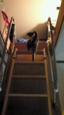 例のごとく、 屋根裏収納を開ける音がすると、 すぐ、雛がやってきます。 最後までおろさずそのままにしていたら 「にゃ~にゃ~」と鳴いて催促! 下までおろすと、可愛いお尻をフリフリしながら あがって行きました・・・。