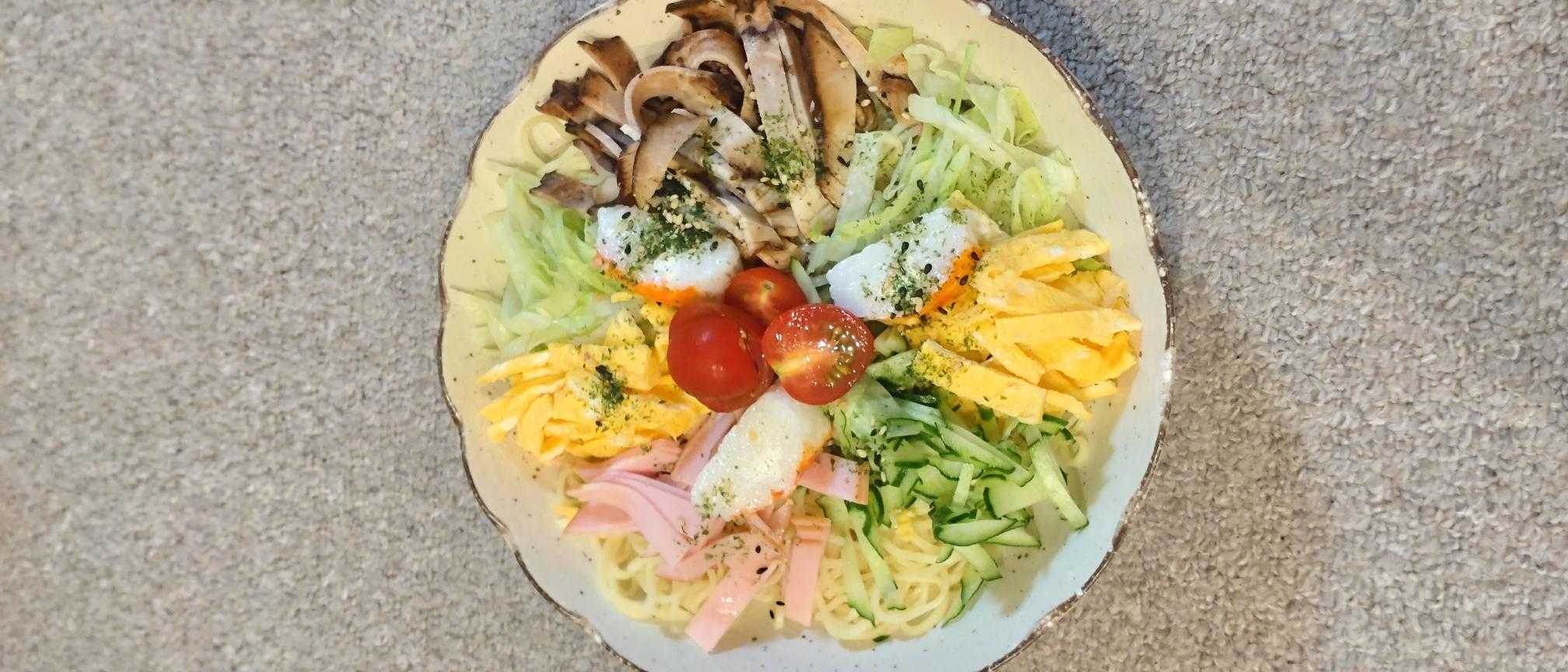 暑いから冷たい麺が多い最近のランチ。(以前のブログ1、2 、3)自分で作る冷やし中華だと卵、叉焼、ハム、キュウリ、レタス、トマト、チーズ入り蒲鉾など好きな具材がいっぱいのせれるから好き。