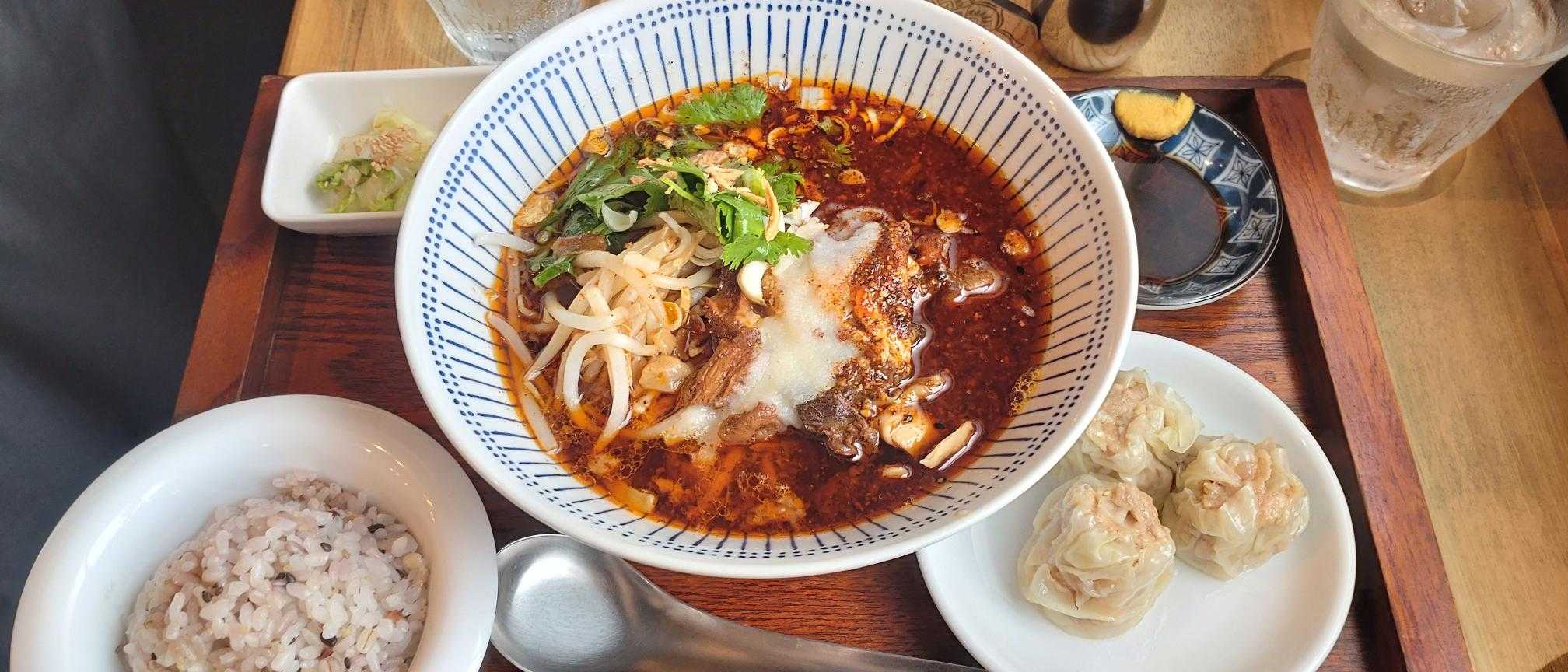 太麺の牛肉麺と焼売と雑穀ごはんの定食。