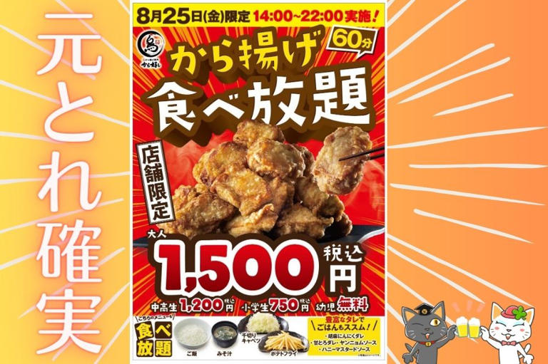 8月25日(金)14:00~22:00限定「から好し」では、大人税込1,500円でから揚げ60分食べ放題を実施店内飲食限定です。ご飯、みそ汁、千切りキャベツ、ポテトフライ、豊富なタレも食べ放題の、絶対元とれなキャンペーンで、みそ汁があるのは重宝する。・ 大人1500円・ 中高生1200円・ 小学生750円・ 幼児無料食べ盛りで、大人以上に食べる小中高生の料金を分けてくれ、から揚げ以外も食べ放題になる粋なサービスというこれはすごいぞ。しかしだが。北陸地方ではから好し 富山空港通:富山県富山市布瀬町南2丁目9-1 076-423-7536から好し 富山新庄:富山県富山市新庄町3丁目7-35 076-439-7033から好し 福井長本町:福井県福井市長本町606 0776-53-3607おい、石川がないぞ。金沢に店舗あるのに・・・。なぜだ。大食いが異常に多いからかそれとも、昔すかいらーくの笠舞店で、店舗内でやくざが銃撃事件をおこしたからなのか。めっちゃ_| ̄|○仕方がないので、日清 焼そばU.F.O. 爆盛でも食べとこう。